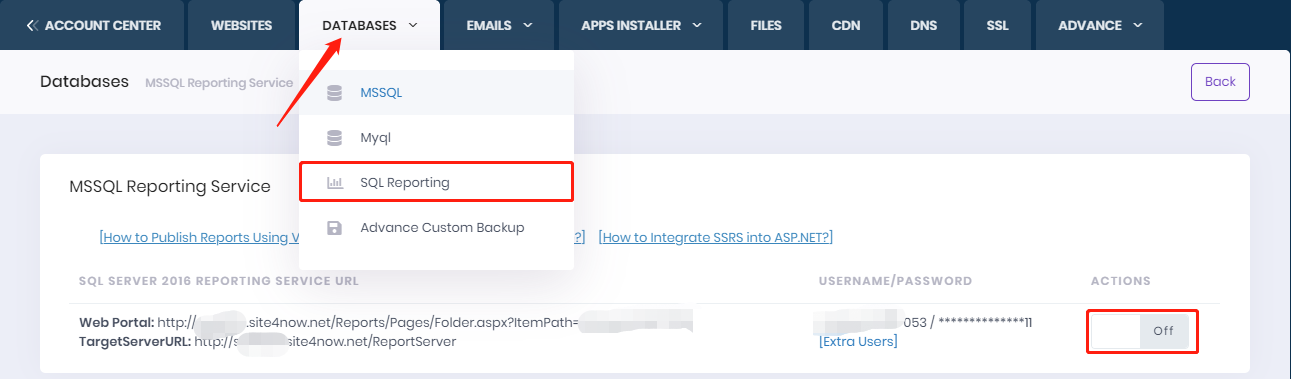 2. Click "SQL Reporting", you can turn it on and use it