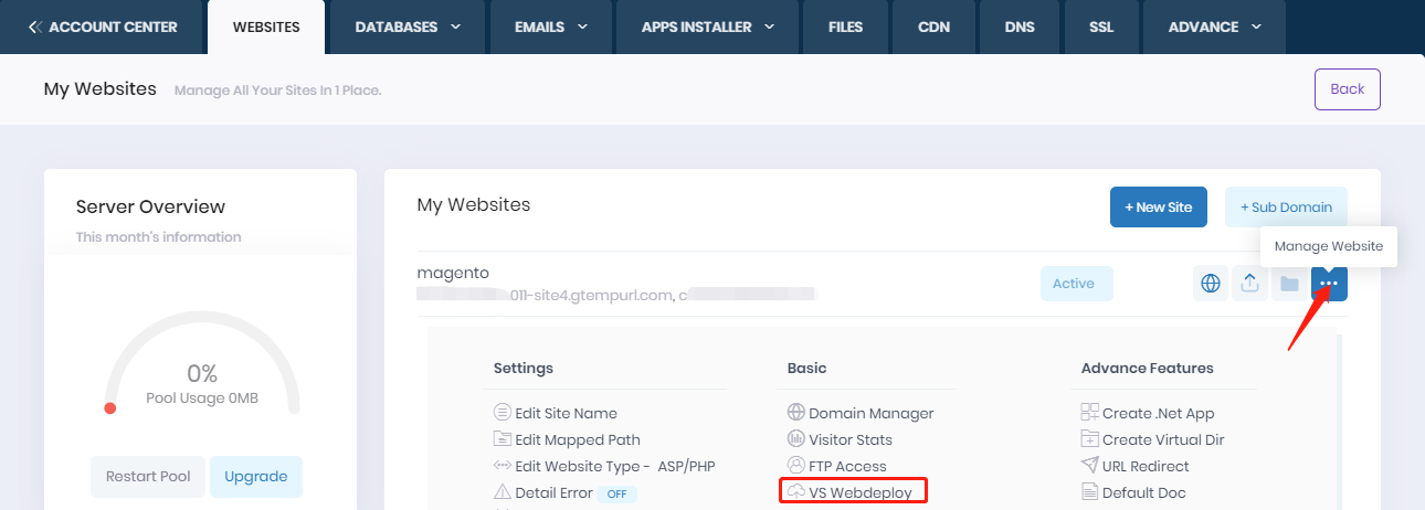 2. You will find "VS Webdeploy" from the panel, click it and then turn it on