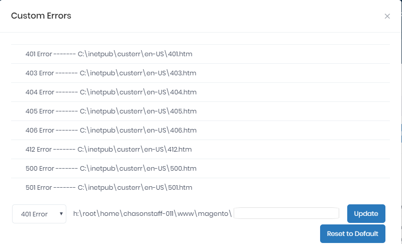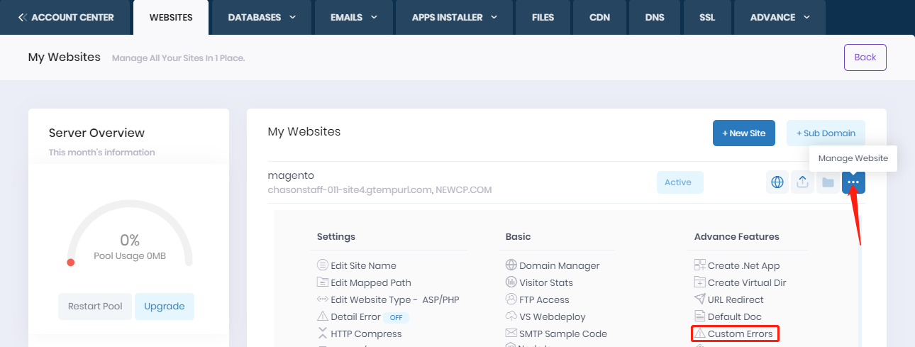 3. Go to WEBSITES --> the specific site -->Manage Website --> Custom Errors: