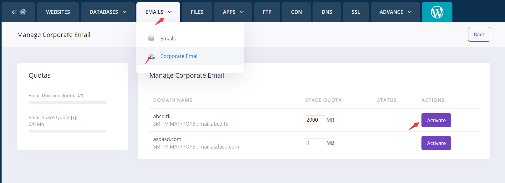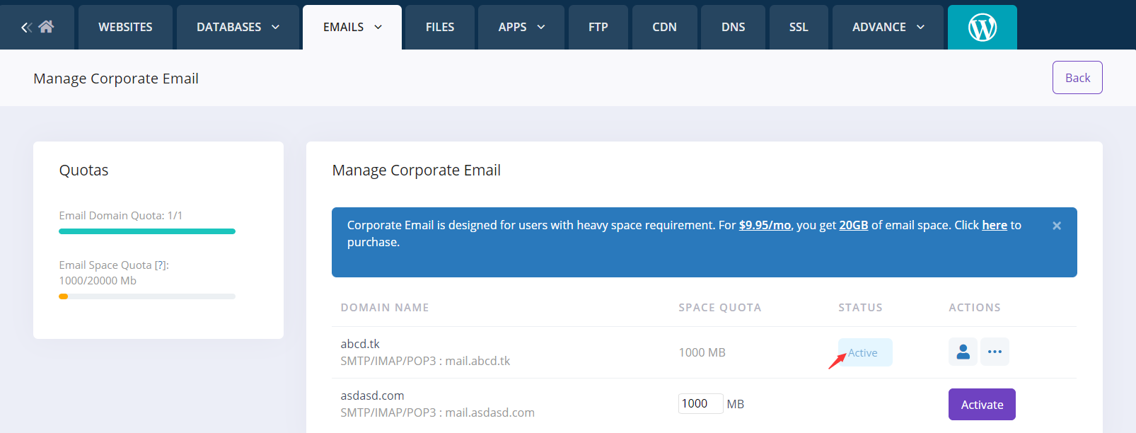 We design a product named "CorpEmail". This add on will allow you to increase your domain email disk space to 20GB. One add on quota is for one domain name.