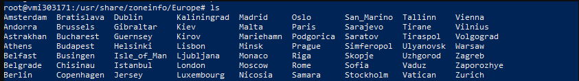 If you go into the “Europe” folder and execute “ls” you will see ever city that is available to choose from: