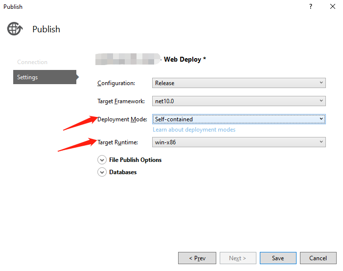 9) Then click 'Next' or 'Settings' button to update the 'Deployment Mode' to 'Self-Contained' and 'Target Runtime' to 'win-x86'.