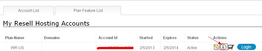 2. Click 'View Hosting Account Info' icon beside the hosting account to view it